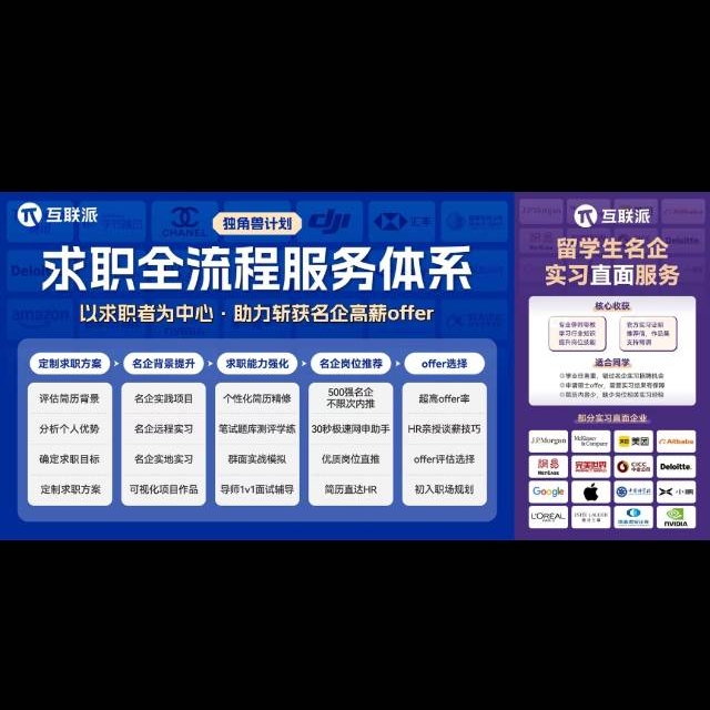 这边介绍一下:如图 左边:求职(独角兽计划)🦄 右边:实习(启航计划)🚢 🦄求职:筛岗位/修简历/笔试题库/群面模拟/1v1面试辅导/无限内推/直推/30秒网申/谈薪……(全流程服务,2w起) 🚢实习:(保offer,拿不到退,1-3w不等) 远程实习:背调+推荐信 实习直面:背调+推荐信+实习证明 互联派优势: 10年公司,专做求职和实习,ai技术支持(30s网申),真人出境好评视频,签约率高,稳健。